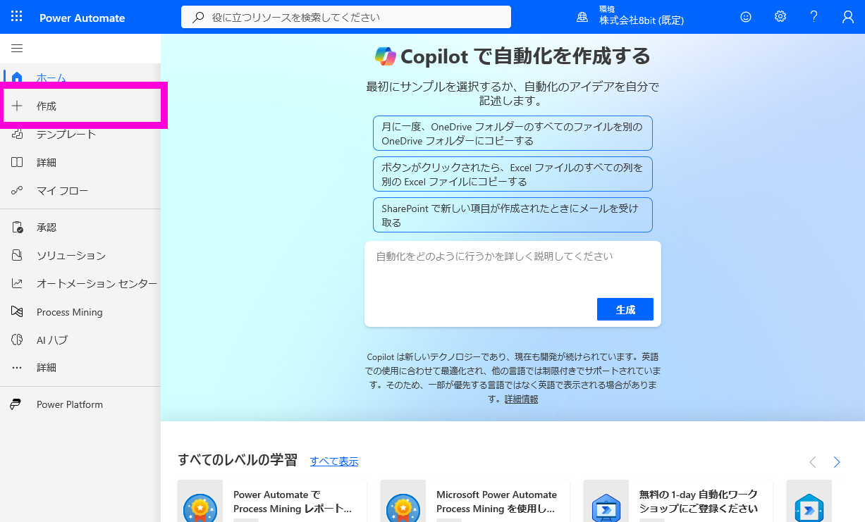 まずは、Power Automateのホームを開き、「+作成」から空のフローを作成してみましょう。