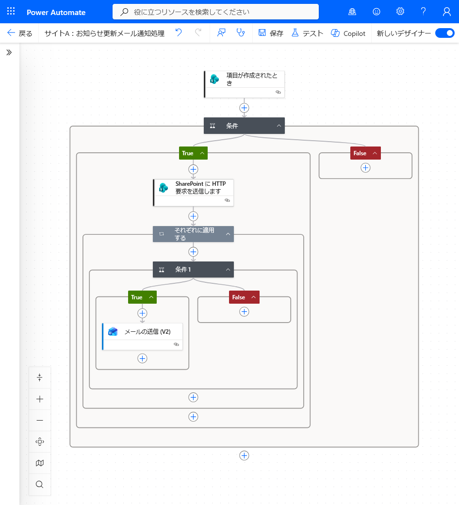 メールの処理を入れてからテストを実行すると、実際のメンバー全員にテストメールが届いてしまう可能性があります。それを回避するため、ここまでできたら保存し、フローをテストしてみましょう。