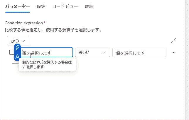 [条件]は、真偽を確かめるコネクタです。設定した条件に合致すれば真(True)、合致しなければ偽(False)として、条件を分岐して処理を進めることができます。詳細情報を表示し、2つの条件を「かつ」で追加します。「かつ」に設定すると、複数の条件が両方とも真になった場合のみtrueのルートに進みます。